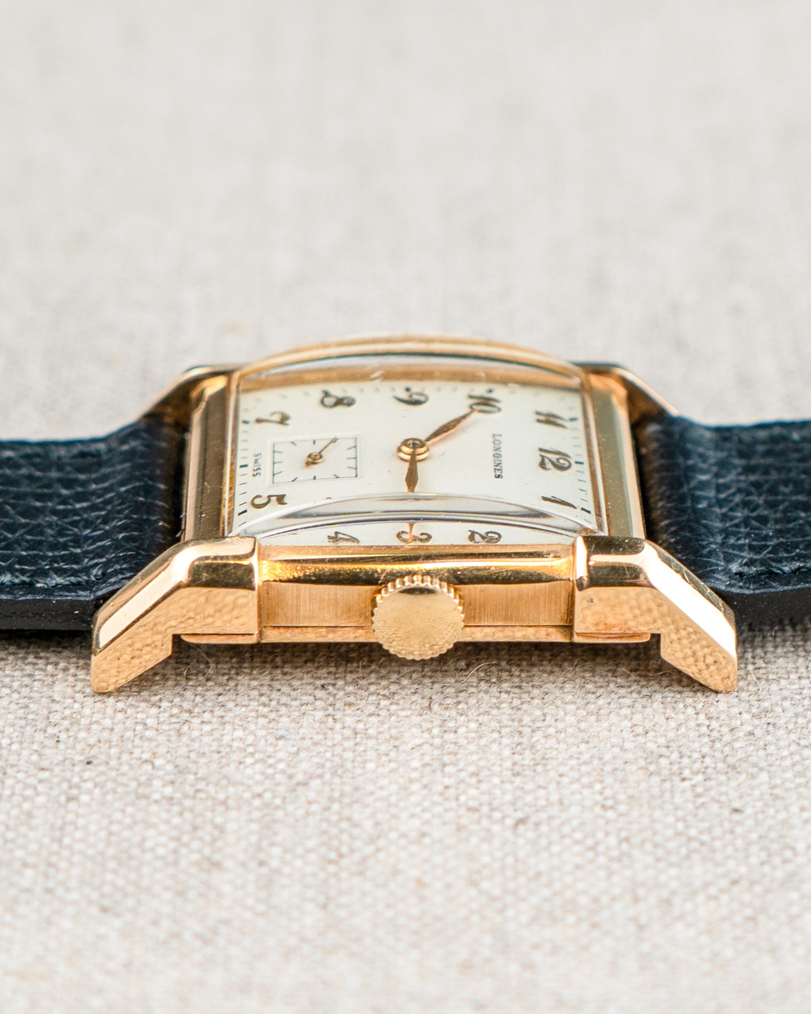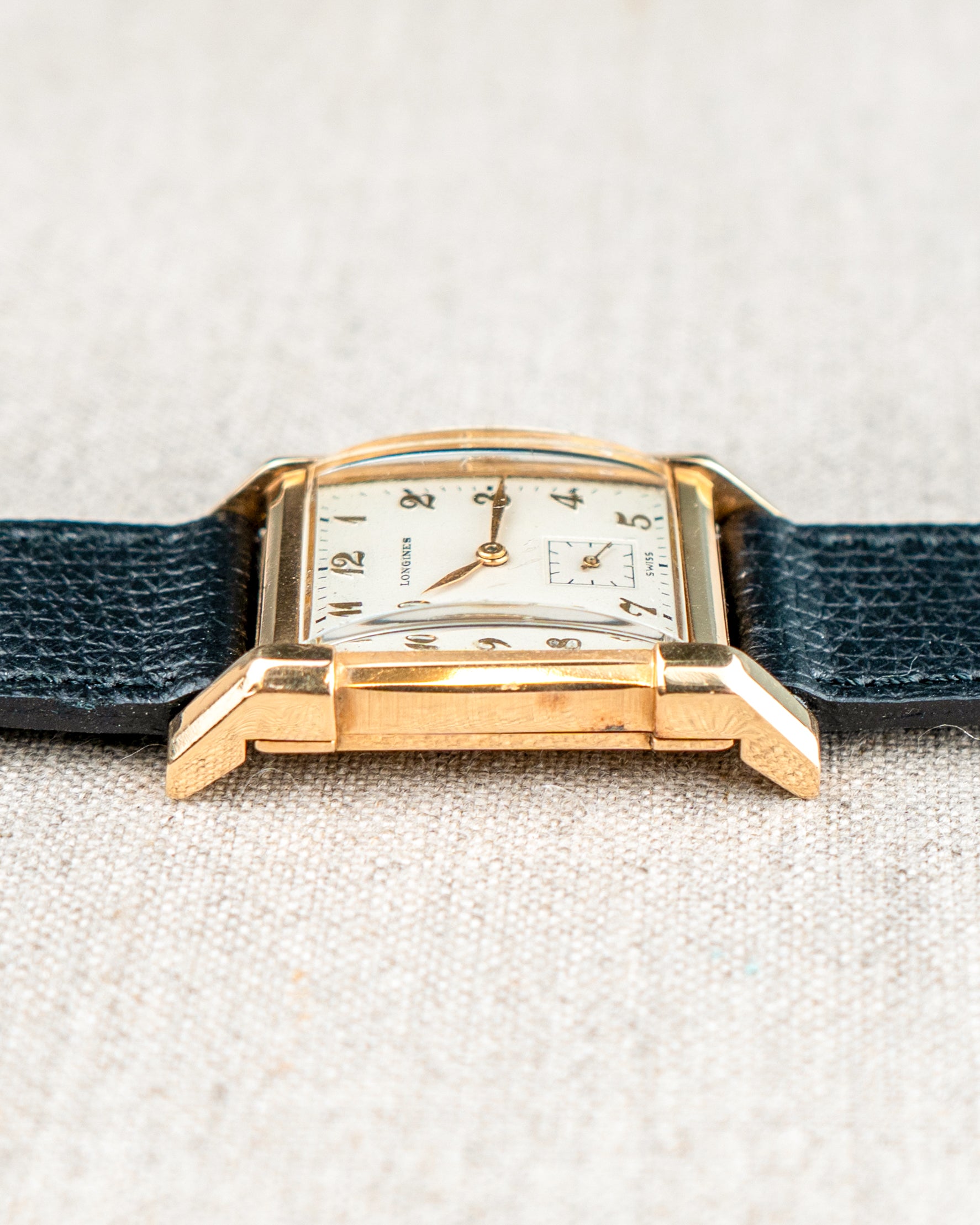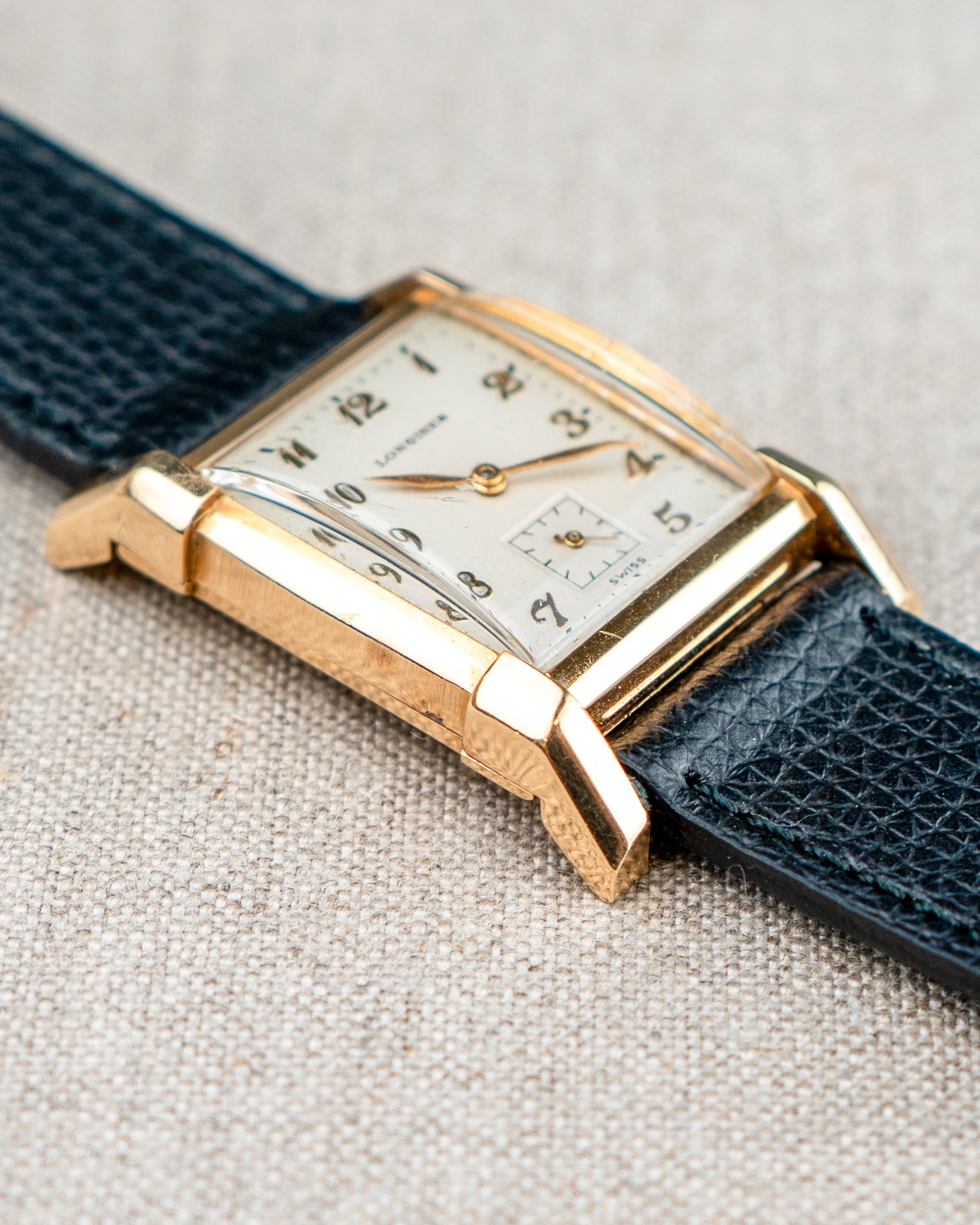 A quiet expression of mid-century refinement, this 1949 Longines exemplifies the understated luxury and artisanal craftsmanship that defined post-war Swiss watchmaking. The solid 14k yellow gold case is masterfully proportioned, its rectangular silhouette brought to life by sharply faceted, sculptural lugs.