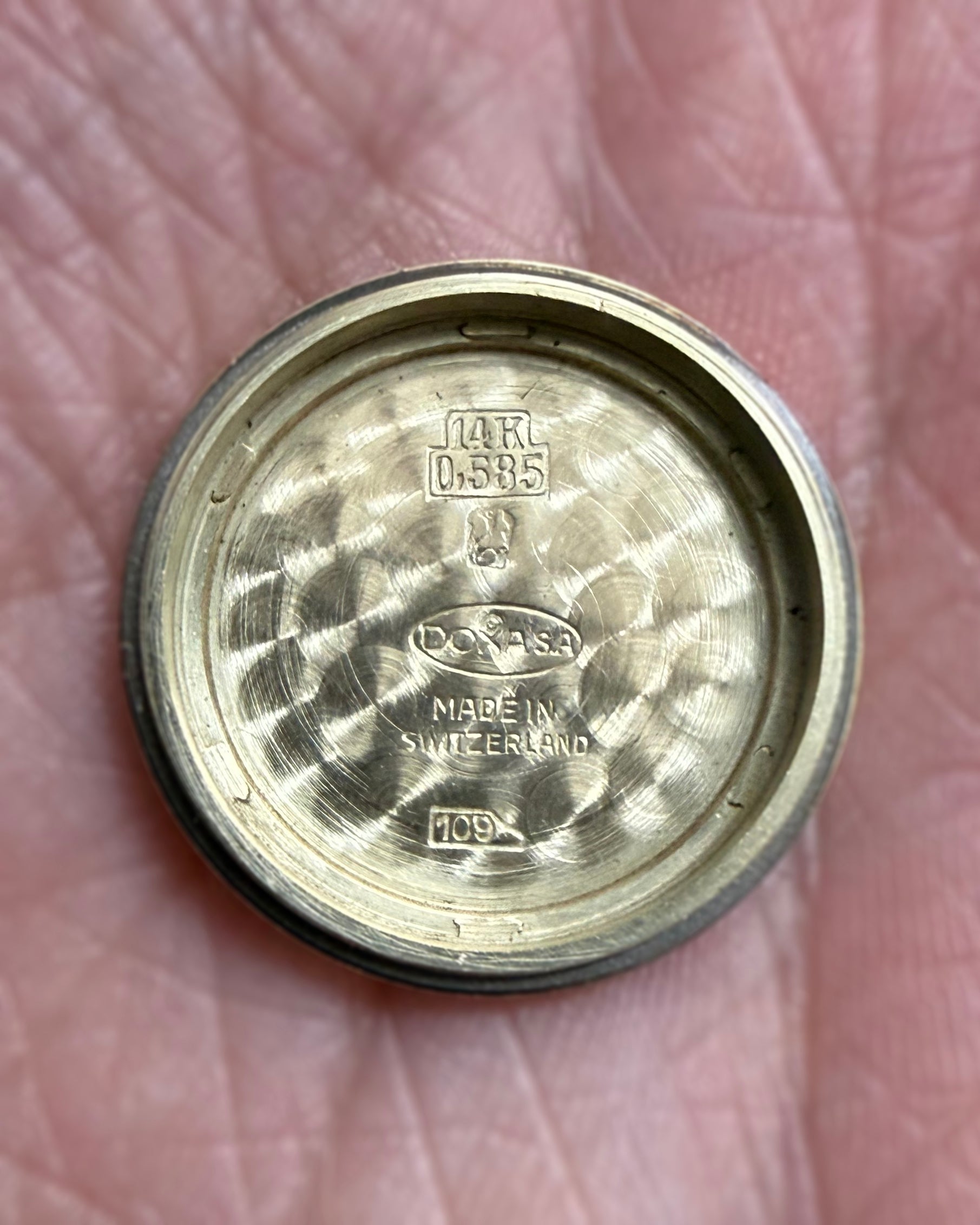 The case of this watch is rendered in solid 14k yellow gold, its gentle warmth enhanced by a softly rounded profile and gracefully symmetrical lugs. At just over 22mm wide, the proportions are dainty by today’s standards but perfectly suited to the period’s sensibilities and the refined wrists it was made for. The patinated silver dial has aged with character, its original luminous dots and bars glowing with a honeyed warmth that only decades under varied light can bestow. Applied hour markers and slender syringe hands offer clarity and balance, while the lack of unnecessary ornamentation reinforces a purity of design that feels both classic and personal. The six-notched screw down case back speaks to Doxa's deep association with diving and tool watches.