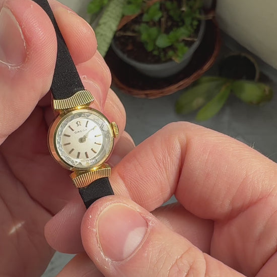 The black suede strap is aftermarket with a genuine gold-plated Omega buckle.