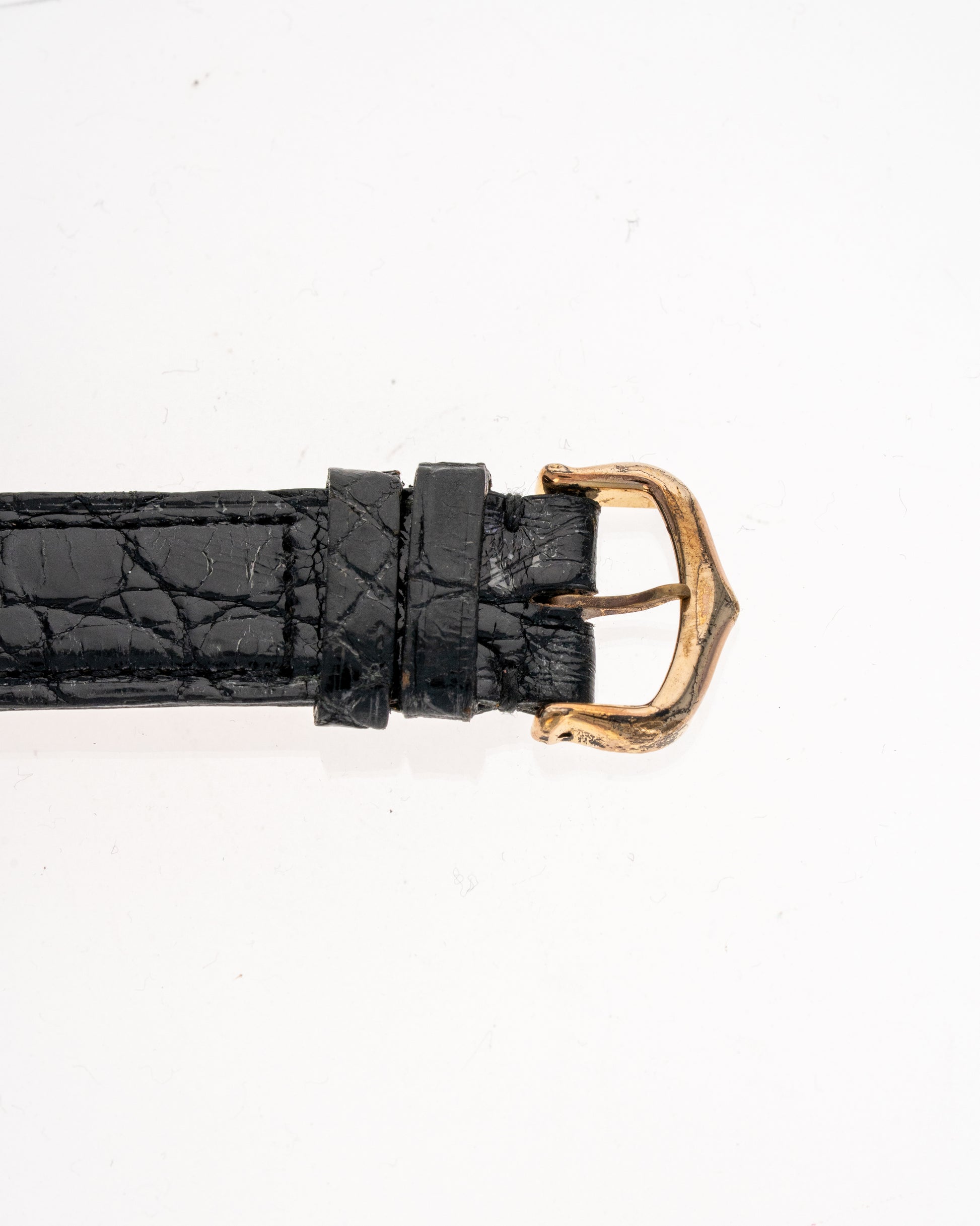 Black Cartier leather strap with Cartier buckle. Buckle exhibits wear and loss of plating.