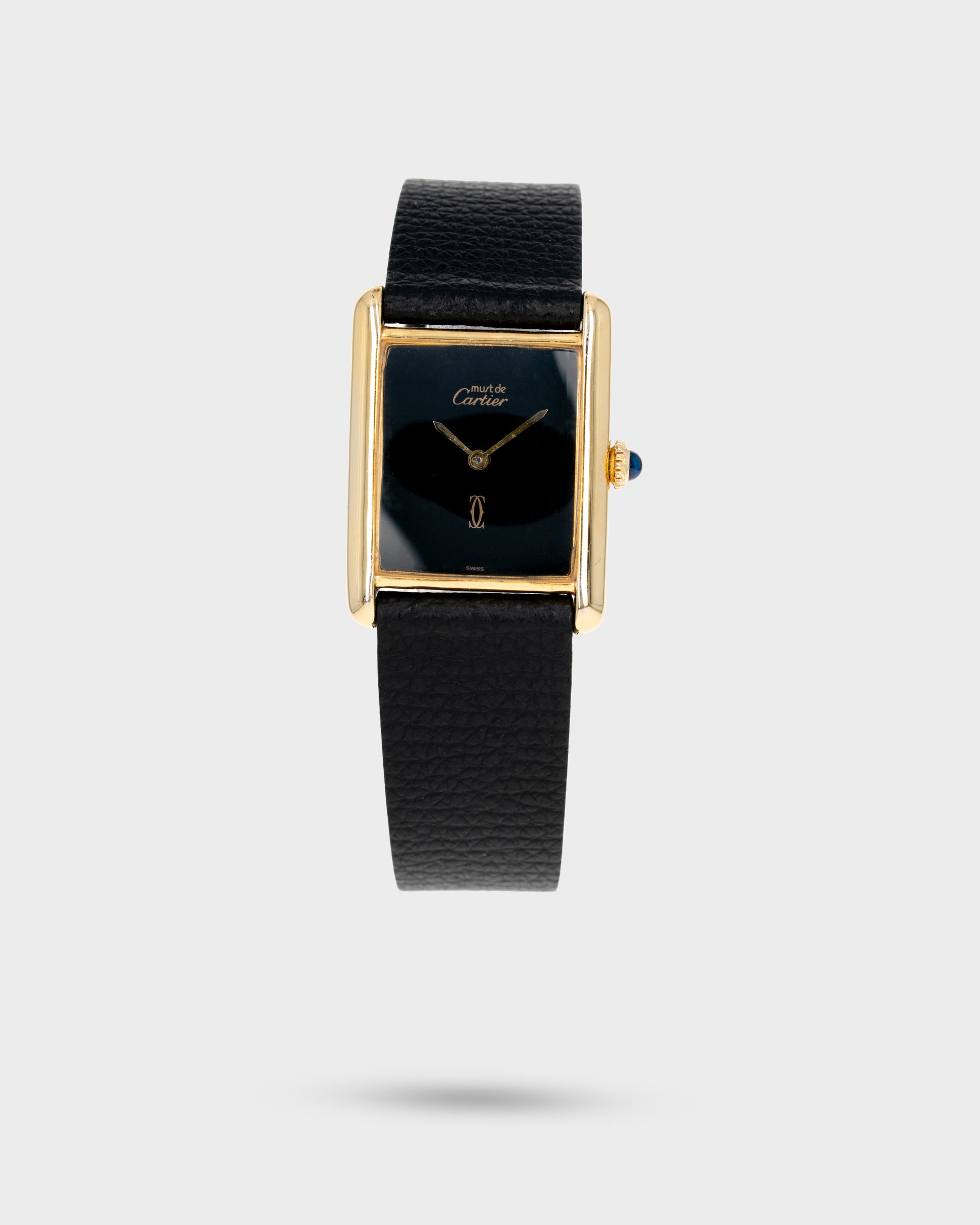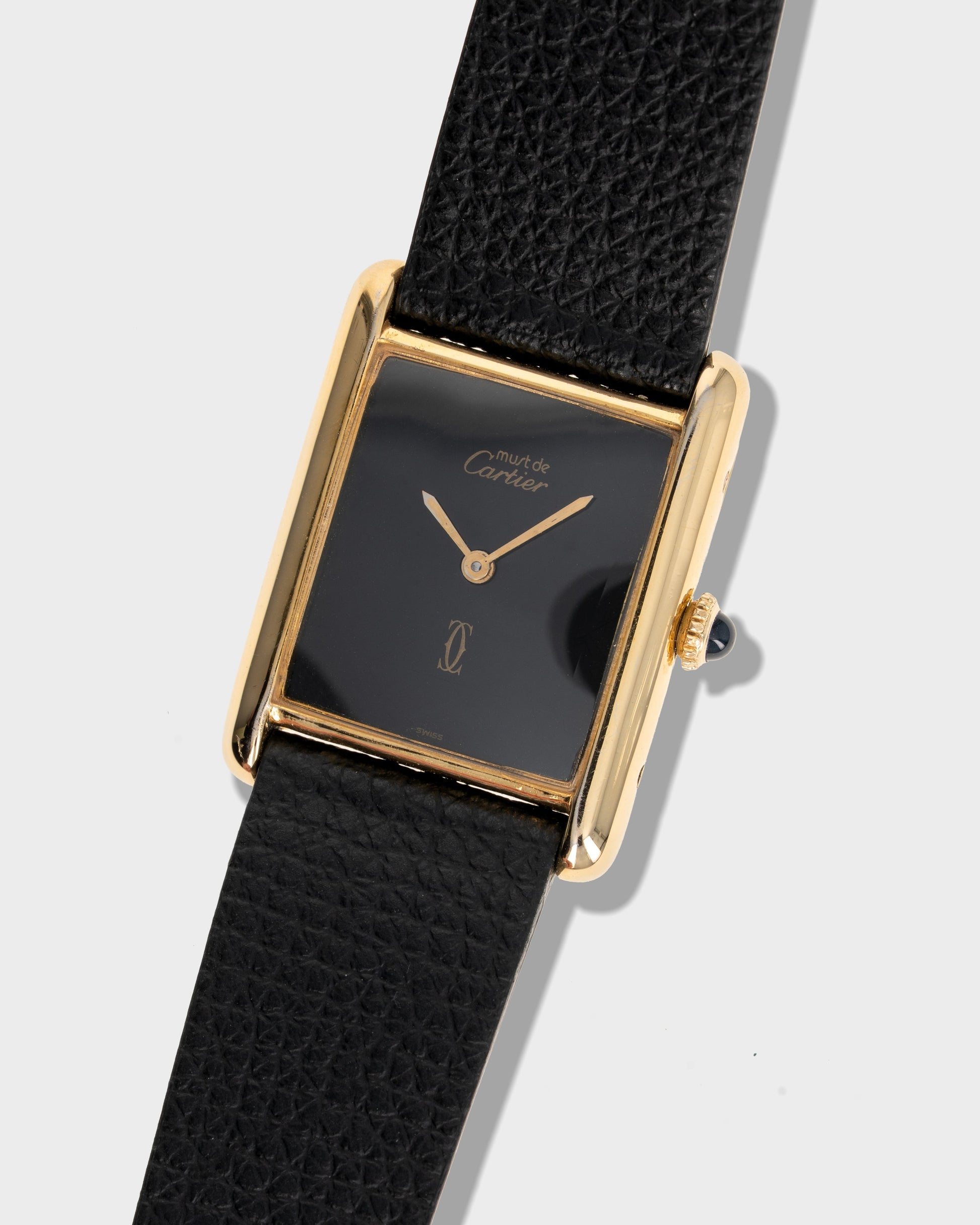 The Cartier Tank is one of the most iconic watch designs ever created. It was first conceived in 1917 and made available in 1919, and its timeless rectangular form has transcended generations of style. Introduced as a more attainable take on the classic, the Must de Cartier line featured vermeil cases (18K yellow gold plated over solid sterling silver) and creative dial variations. This black-colored dial example features Cartier’s signature 'Double C' logo at six o'clock. Its simplicity captures all of the enduring charm of Cartier design in a distinctive and collectible expression for less than its solid gold counterparts. The original Cartier high grade manual-wind calibre is based on the highly respected and reliable ETA 2512-1 movement, so this timepiece is a workhorse as well.